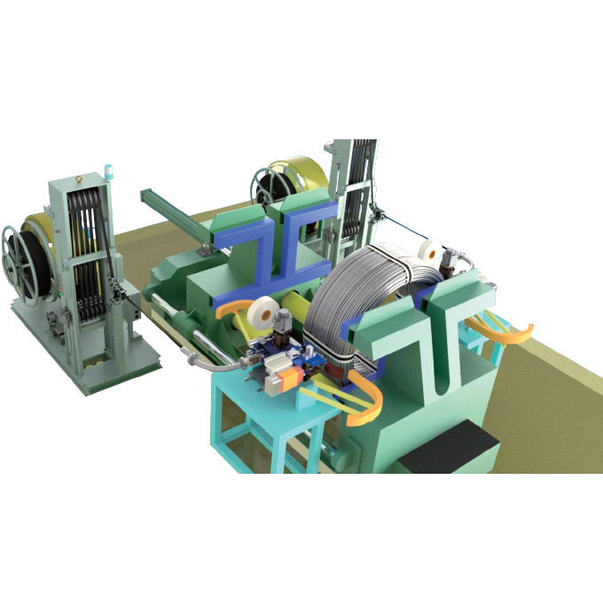원형으로 말려있는 CHQ Wire(냉간압조용 선재, Cold Heading Quality Wire)의 묶음 다발 제품을 수평방향으로 압축 및 결속하는 무인 자동화 설비.
